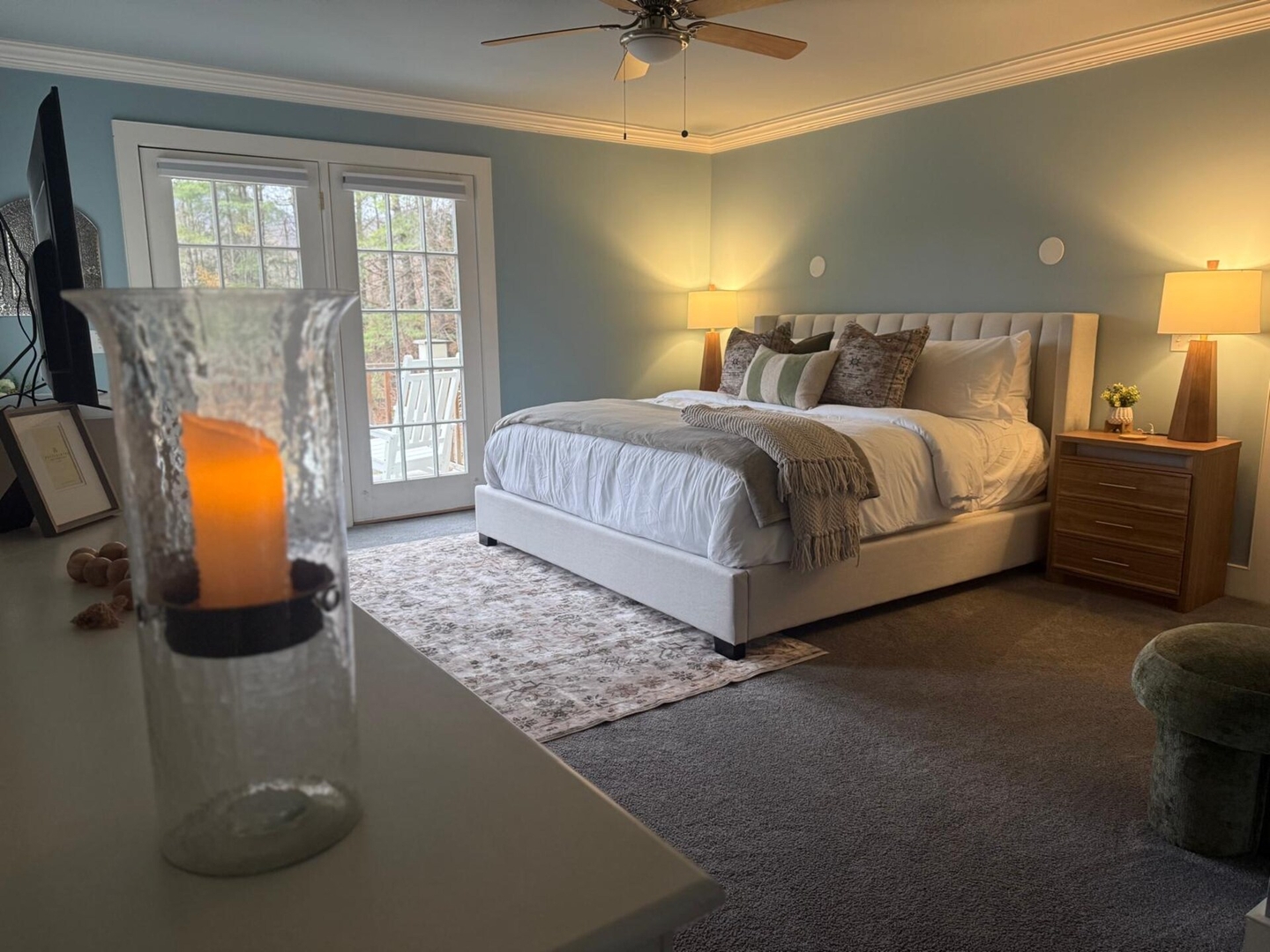 Bedroom 4: (Blue room) King bed, shared bathroom, panoramic pond views, reading nook, smart tv.